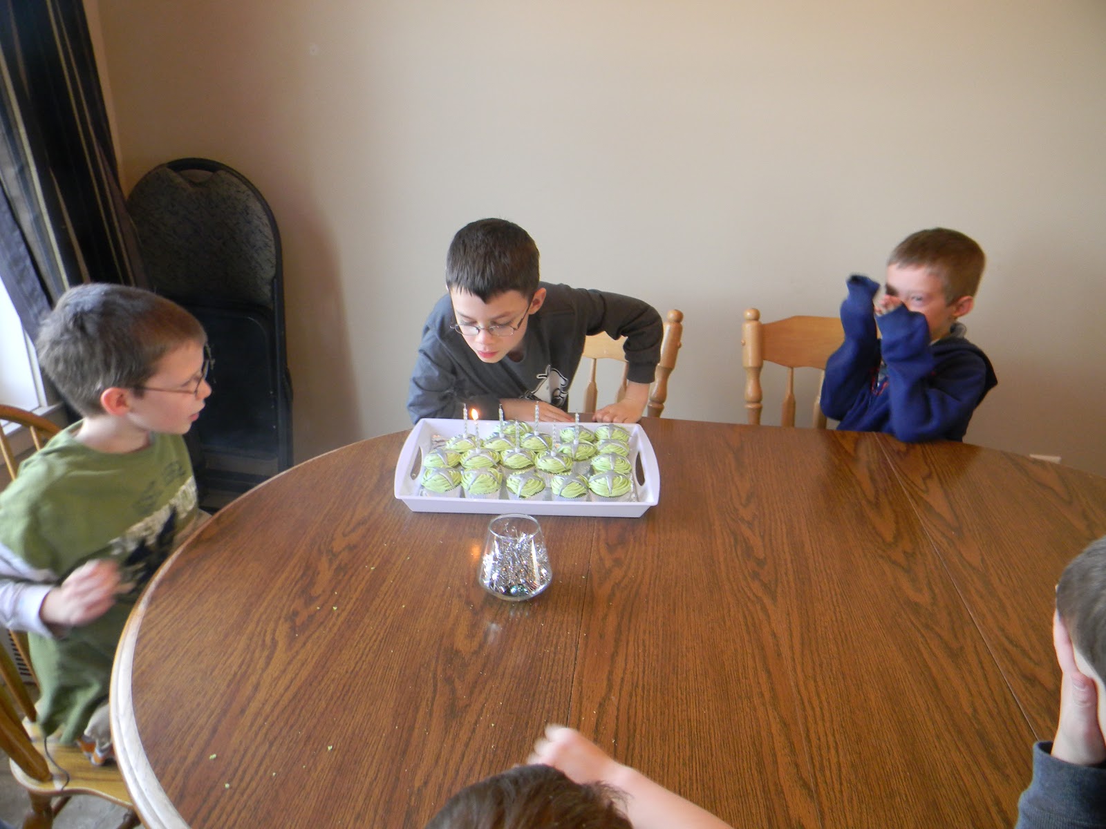 Nate's birthday started Friday night when Ryan and I took him and his cousin Ben out for dinner at Moxie's. Its always fun and special to do things like this with one child at a time, and we really enjoyed our dinner with the two boys. We sure love Ben and were glad he could come and sleep over as well. I really hope the two cousin's will be best friends forever. Nate was especially happy he got to have two glasses of sprite! Saturday he had his birthday with his friends. He invited 3 friends over to play xbox. They had fun playing Kinect adventures and sonic racing. We're grateful that Nate has such good friends. My friend made him some Xbox cupcakes which were rootbeer flavored and delicious! Thanks Megs! Nate loved them and had two eaten before his friends had one eaten. On Sunday, we had mine and Ryan's immediate families over for supper and dessert. Nate wanted ichi ban so I compromised with a white sauce spaghetti. I messed up on the sauce and had to fix it and there ended up not being enough for anyone to have second's. I'm still not good at feeding lots of people and had moment of frustration where I was really wishing my Momma was here to help me, cause of course she would have known exactly what to do. We had skor cake and apple pie for dessert and did a pinuata for the kids. It was so much fun! We are very blessed with two amazing families! Nate got spoiled, especially by his Grandpa Jim and Penny. The boys had been asking for DS's for Christmas and I flat out told them no, not this year. Well, my Dad found one on sale on Kijiji that came with seven games. I don't know who was more surprised, me or Nate! I think he had a really good weekend! I always hope that my kids feel really special on their Birthdays.
